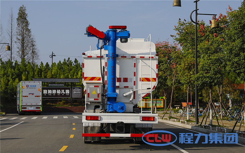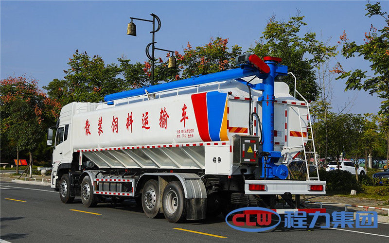 散裝飼料車的飼料罐架設(shè)在卡車的底盤上,罐頂開有進料口.頂部的一根螺旋輸送卸料管(俗稱卸料絞龍)則可自由回轉(zhuǎn)和抬升,抬升的仰角可達60度。運輸時,頂部的螺旋管平臥在罐頂;卸料時則抬起,使管端的出料口與畜禽飼養(yǎng)場貯料罐頂部的進料門相接,駕駛室內(nèi)裝有操縱裝置,卸料時通過車底的動力輸出軸和減速器來驅(qū)動螺旋,以完成卸料。目前國內(nèi)主要推出3T、5T、8T、11T、15T和22T等多個噸位車型。