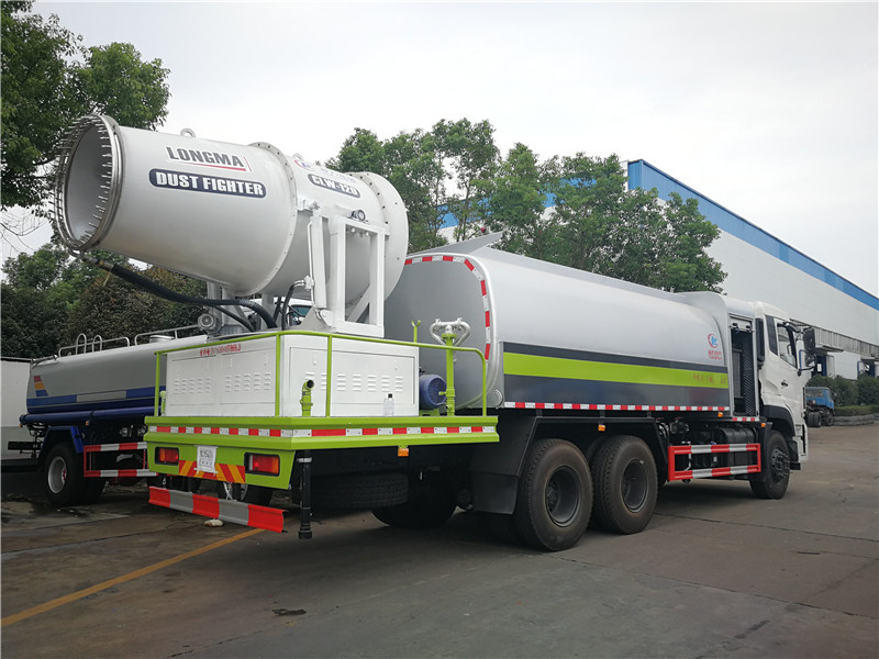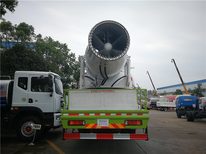這款抑塵車的灑水炮可全方位旋轉(zhuǎn),可連續(xù)調(diào)成直沖狀、大雨、小雨、毛毛雨,霧狀可調(diào)節(jié)沖洗高大樹木,引水時間<5min,流量90m3/h。帶1個消防接頭,帶1個自流閥,1個過濾裝置、人性化爬梯及側(cè)防護欄,安裝灑水音樂喇叭。這款車的底盤型號:EQ1075SJ3CDF,軸距3308mm,發(fā)動機Q23-115E60,85KW,萬里揚5TS40,7.00R16,斷氣剎,空調(diào)、電動窗、中控鎖。同時,這款車的上裝配置是主管道加粗至76mm,前沖、后灑、高炮,配本田柴油全自動30米霧炮。