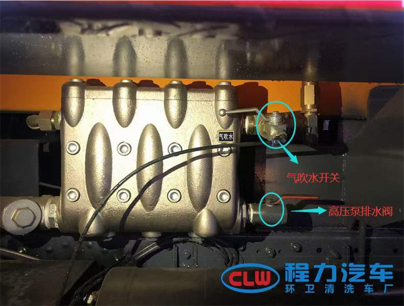 3:清洗吸污車水排凈后,使用車輛的氣推功能,把高壓管和高壓泵里的水吹干凈