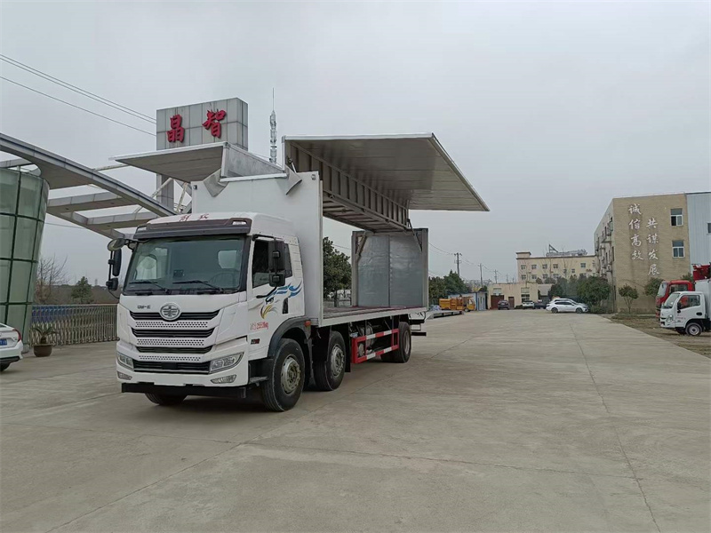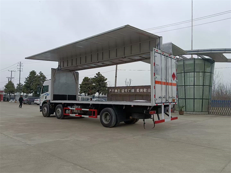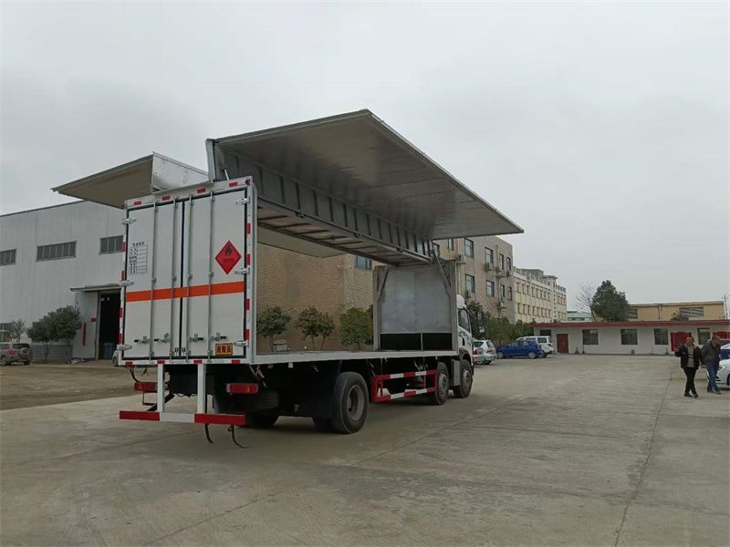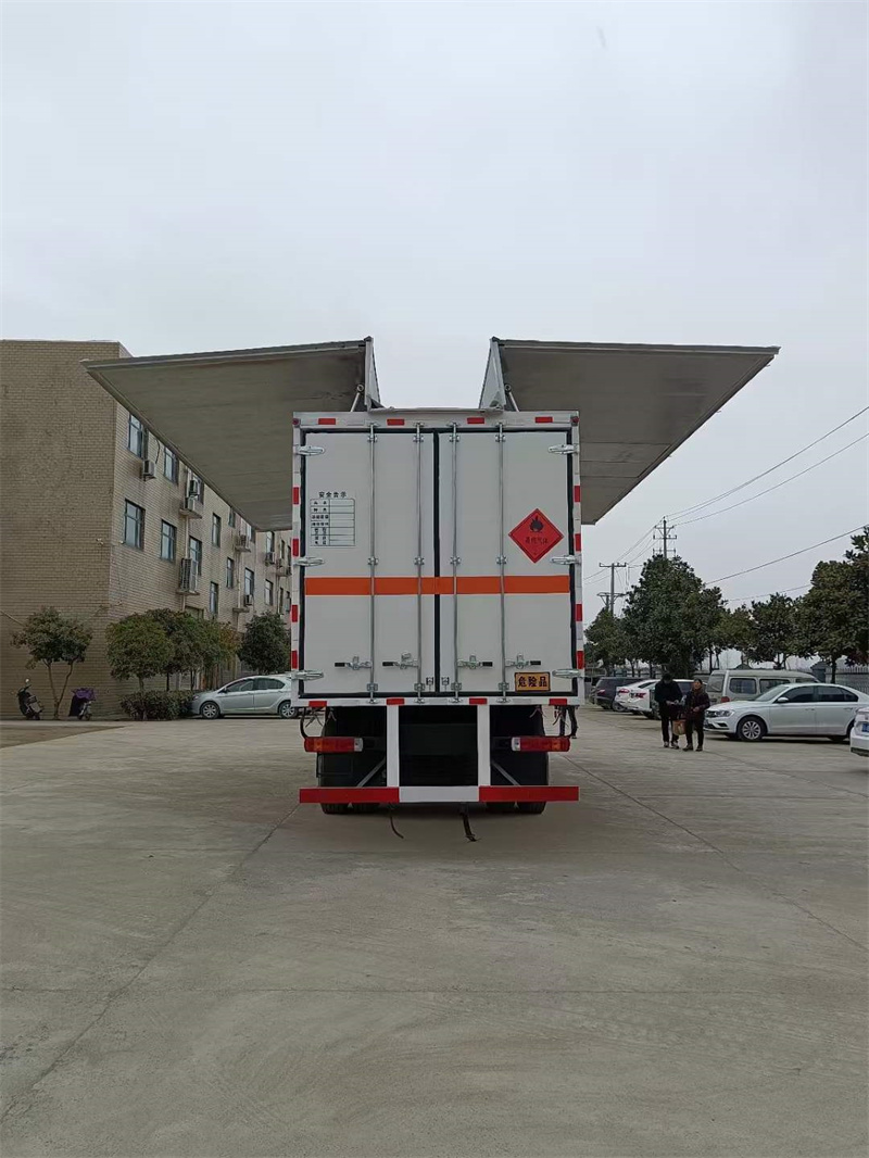 上裝配置:外板采用冷軋鋼板一次性沖壓成型的百葉窗,內(nèi)飾為導電性能良好的鋁板有透氣孔,內(nèi)襯為矩形管骨架牢靠穩(wěn)定,骨架內(nèi)部填充為透氣防潮阻燃的擠塑板。廂體外部四周鋁合金型材包邊,底板和車廂前下部鋪橡膠皮,后門雙開,右側(cè)選裝側(cè)開門,內(nèi)部安裝固定貨物的臥環(huán)或腰欄,安裝煙霧報警器、防盜感應(yīng)器。車身附件靜電接地帶、滅火器、防火罩、危險品三角燈、橙色反光帶、CCC反射器、菱形標志牌、危險品牌、安全告示齊全。