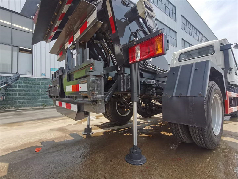2、與大中型垃圾壓縮車對(duì)接,伸出支腿,傾翻垃圾箱,打開刮板,傾倒垃圾。