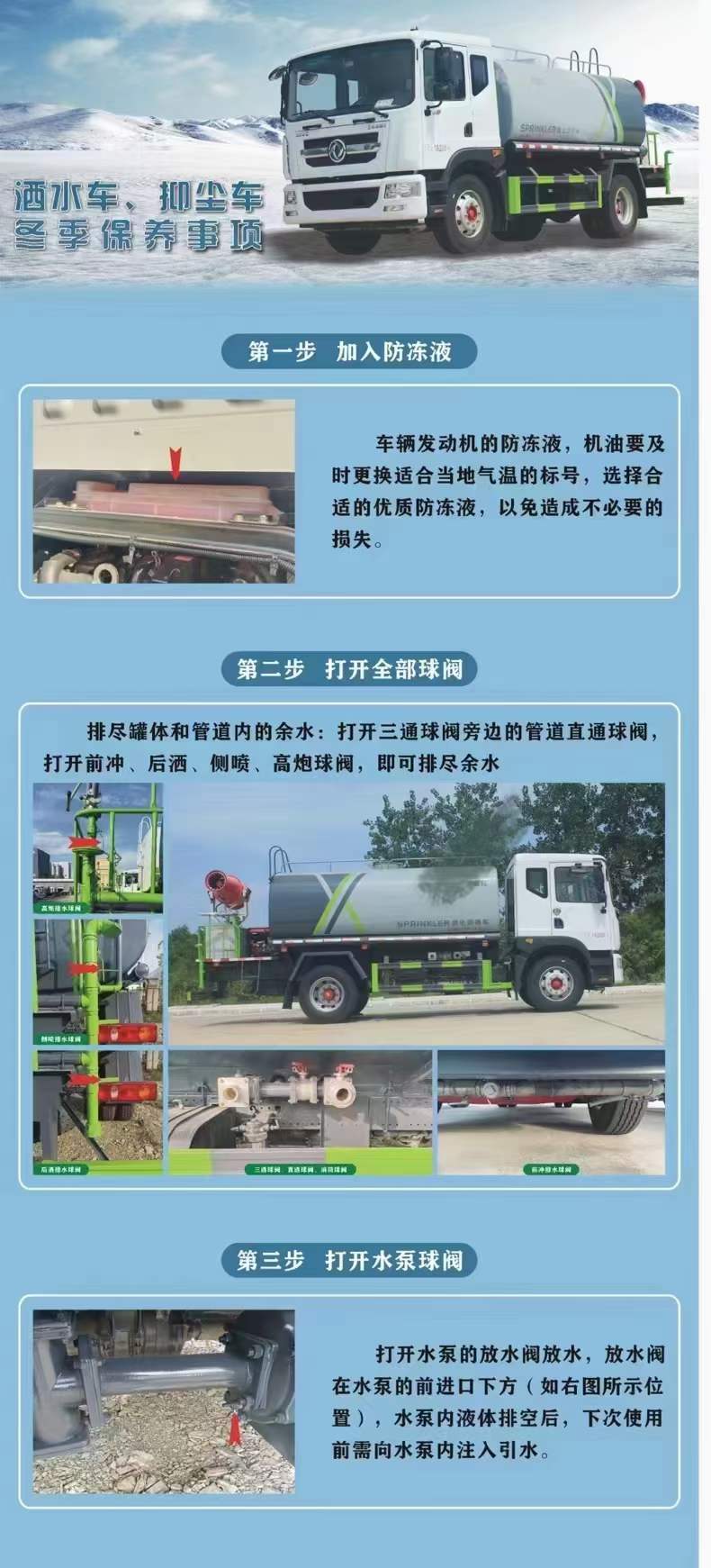 當氣?溫低于?零度時,應及時?打開灑水車所有管道閥門,排盡灑水車罐?體及管道?余水,并使球閥保護打開狀態(tài),防止?管道、球閥凍?裂。