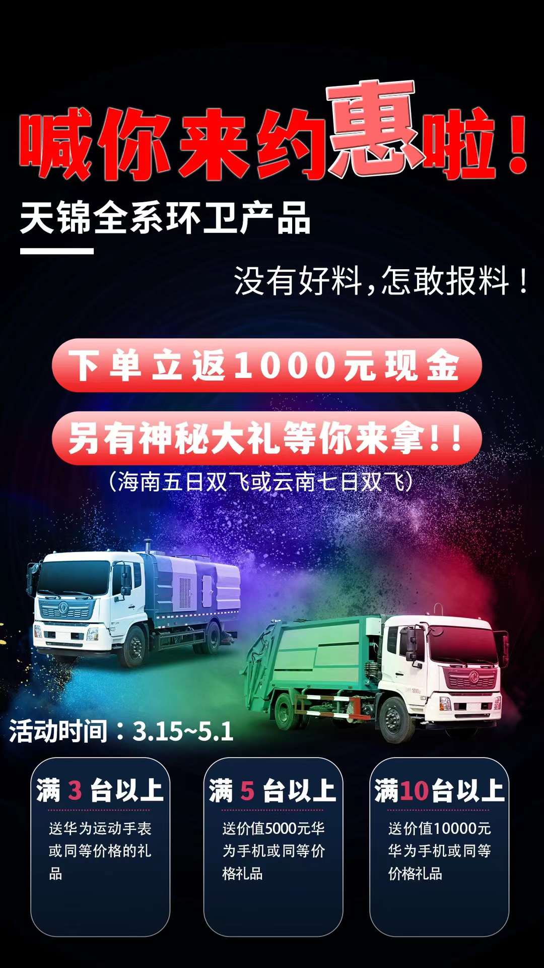 即日起至5.1日購程力集團天錦全系環(huán)衛(wèi),單臺下單立領(lǐng)1000元現(xiàn)金。