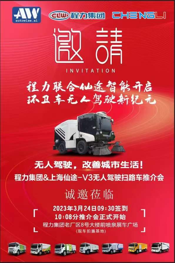 程力集團攜手上海仙途智能科技有限公司,研發(fā)制造首款程力仙途-V3智能化無人駕駛掃路車,已量產上市。公司定于3月24日上午9:30-11:30,在程力老廠噴泉廣場現車拍攝基地,隆重舉行產品推介會,參會嘉賓均有機會現場抽大獎,并領取精美伴手禮,一起見證無人駕駛環(huán)衛(wèi)車的高光時刻。