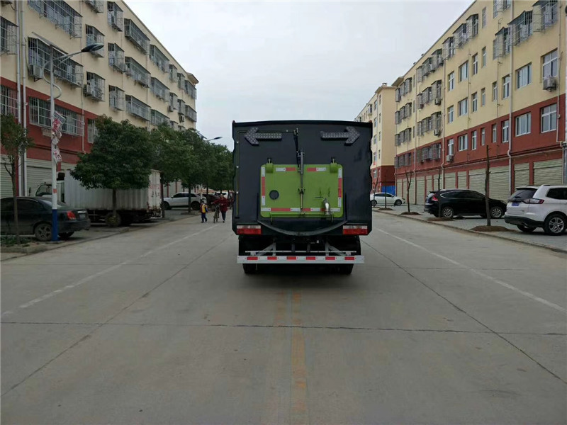 這款洗掃車在右掃盤及垃圾箱后部設置高清晰監視探頭,駕駛室內設置高清晰液晶顯示器,畫面可分別切換到右掃盤位置及垃圾箱后部位置,作業時,可對掃盤作業工況和整車作業質量進行監控。具備垃圾箱舉升安全保護裝置,在后門未打開狀態下,確保垃圾箱無法舉升。垃圾箱采用4mm不銹鋼材質,可以防止一般性腐蝕,延長使用壽命。采用清水箱前置、污水箱后置的布置方式,半封閉式副發動機倉,左右開啟雙側門,方便人員輕松進入維修。
