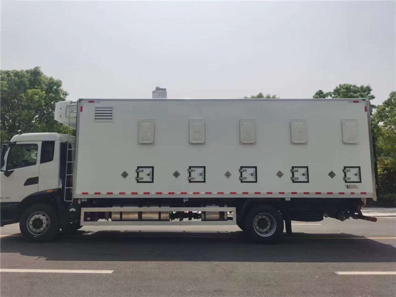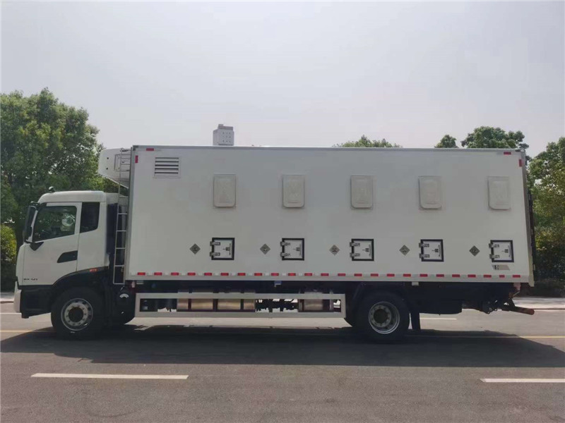 車廂結(jié)構(gòu):車廂前部有1.2米混合倉,配有5個鼓風(fēng)機,裝有散熱蒸發(fā)器, 加濕噴霧器,車廂后部為雞苗存放處,車廂頂部,左右兩邊配有出風(fēng)通道, 車廂內(nèi)部配有八個環(huán)境溫度傳感器,和二氧化碳監(jiān)測器,配有240V發(fā)電機。