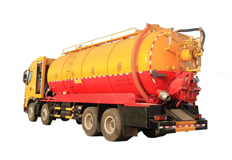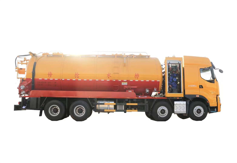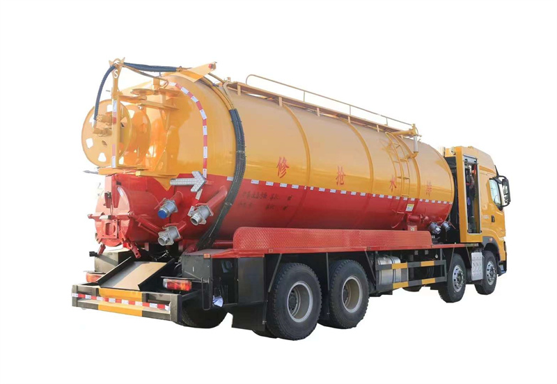 水罐污罐內(nèi)封頭隔斷。清水罐兩側(cè)一邊一個消防栓進(jìn)水口(副駕駛一側(cè)直通罐頂),兩側(cè)安裝量管、安裝小球閥放水。清水罐底部一個65方形排水閥。清水罐頂一個排氣閥。兩個三爪罐口(清水罐一個,污水罐一個)。清水罐、污水罐內(nèi)部安裝爬梯。視糞窗(安裝圓球閥),兩倉互通。污水罐體內(nèi)鋪不銹鋼薄板,罐體尾部一個700液壓開蓋,罐體兩側(cè)平臺用花紋板圍邊,平臺做滿。罐后封頭左側(cè)球閥1個6寸150球閥和4個寸的自流一個,600液壓門,右側(cè)4寸100鋁合金進(jìn)料口。寸自流口后不開大門。體副駕駛后部一個150不球閥側(cè)排。清水罐、污水罐互通。平臺罐頂部兩側(cè)防滑平臺和護(hù)欄,后封頭一個視污管(安裝圓球閥),罐頂抽氣管加一個球閥開關(guān),里面安裝自制防溢流閥。雙耀品浮315流量高壓泵,氣吹水,100米25高壓管,選裝濰柴420副發(fā),后封頭液壓卷盤折疊、伸縮。后尾部封頭裝箭頭燈。M型保險杠(兩邊封口),安裝大工具箱,按照客戶提供圖片制作,其余廠內(nèi)標(biāo)配。