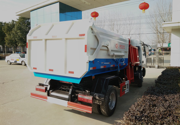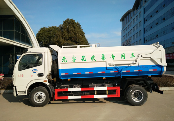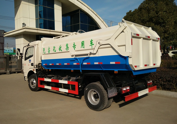 上裝配置:側(cè)面掛桶,容積約8立方,采用特種鋼板制作,箱體底板4mm,邊板3mm,箱體內(nèi)部帶液壓推板,將垃圾壓實,側(cè)面帶掛桶擔(dān)升機,提升速度快,尾部帶3mm橡膠密封條,污水不滴漏,箱體油漆及噴字按用戶要求定制。