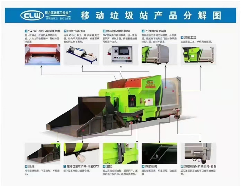 東風(fēng)?21??方移動壓縮式垃圾站,箱體?用采??345錳鋼?焊??接箱體,湖北拓創(chuàng)?動??力單元,?威??森博樂油缸,?意??大利換向閥,卡薩帕齒輪泵,施耐德斷路器,?歐姆龍繼電器,7寸?液??晶顯示器,西門子電機。