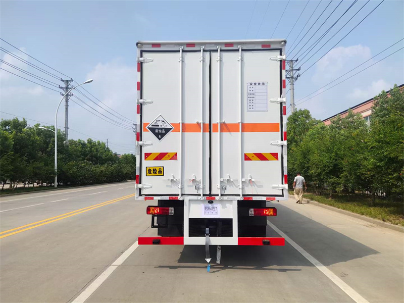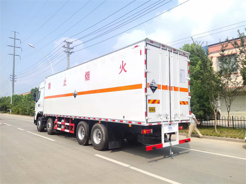 廂體配置:嚴格按照公告尺寸制作,外板采用1mm厚冷軋板有一次性成型的百葉窗,內(nèi)飾為導電性能良好的鋁板有透氣孔,內(nèi)襯為矩形管骨架牢靠穩(wěn)定,內(nèi)部填充為透氣防潮阻燃的擠塑板,四種材料經(jīng)現(xiàn)代工藝復合而成,廂體外部上下鋁合金型材包邊,底板和車廂前下部鋪橡膠皮,后門雙開,右側叁個雙開門,內(nèi)部有固定貨物的臥環(huán),車輛外部有靜電帶、滅火器、防火罩,車廂內(nèi)安裝煙霧報警器和門防盜報警器,嚴格按照國家危險品相關法規(guī)張貼。